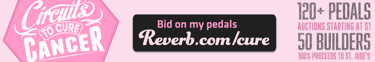 Circuits to Cure Cancer is a great thing. Basically, it’s an event where many pedal builders donate their pedals for auction on Reverb.com. All (100%) proceeds from the auction are then given to St. Jude’s Children’s Research Hospital. The time to contribute is from May 30th to June 7th, so there is still time to place your bid.. and for a great cause. Last year they raised over $30,000 for St. Jude’s, which is outstanding. For all the non-players out there, you can simply donate as well and not necessarily need to bid on a guitar pedal.