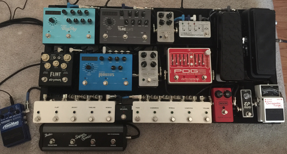 Loop 4: Strymon Flint w/ external tap switch to tap out them time (placed between true bypass loopers)