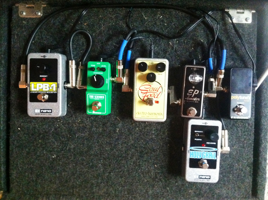 The EP Booster is an “always-on” pedal that pushes my the output of my OD pedals as well as my amp. It has a very dynamic response that lets me go from clean to break-up. It really fattens up my two OD pedals. The Soul Food is for light OD, the Mini TS for moderate drive tones, and stacking all three gives me a really nice saturation. The LPB-1 is there strictly for leads/solos. It’s actually a fantastic boost pedal, despite what it’s modest price tag might suggest. It doesn’t fatten up your tone like the EP Booster does, instead it’s a bit more open to my ears and seems to accent my high-mids and treble a touch, which is great for a solo.