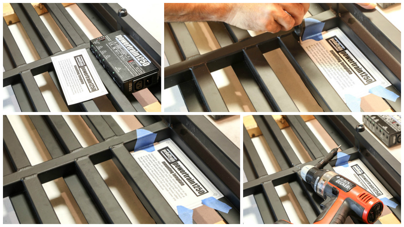 The Powertrain 1250 comes with 4 rubber feet at the bottom of the unit. The feet are there if you want to set this on the floor, etc. You’ll need to remove these feet and either use those screws or use the other screws provided in the box. These will be the mounting screws. Use a hand drill to drill the holes. Now, I did run across a problem. The bottom two holes were easy to drill, but the chuck of my drill was obstructed by the top rail. Instead of drilling at an angle (remember, those drill holes need to be perfect). I used the two holes previously drilled as a guide for my template, and flipped the board and drilled the remaining holes from the top.