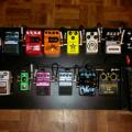So, seeing as I mostly play in my living room, I don’t keep a regular pedalboard- I’ve got a couple of hand built boards, but I usually don’t haul them out. Still, I view effect pedals like a painter views paint, so I keep a pretty well stocked palette, as you can see in the photos( some show 90% of the total collection, I’ve got a couple of fuzzes, and chorus pedals, as well as tuners that aren’t shown.. Some are vintage, some are hand built, some are “boutique”, most are cheap- I really don’t see the point of getting a 300 dollar pedal, when I’m playing through a practice amp, just for my own amusement. So, the line up I was using today, for a variety of early 1990’s sounds, goes from my vintage Epiphone SG copy (it’s a 1993 lefty Epiphone, G-300- precursor to the 310. Bolt-on mahogany neck, rosewood fingerboard, with a 3-piece alder body I’ve added Sperzal tuners, Graphtech nut and Saddles, and a Dimarzio Super distortion in the bridge) into a