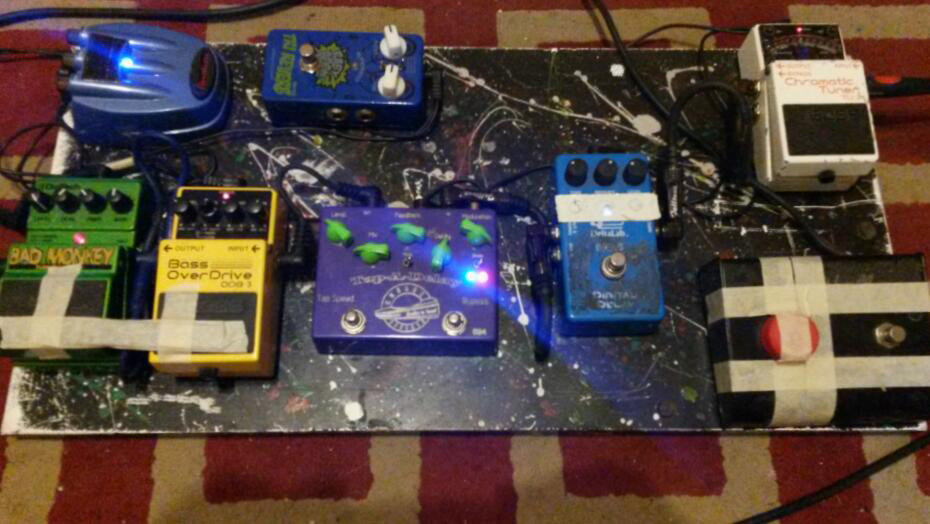 The pedals I’m using right now are a DeltaLab DD1 Digital Delay, a Cusack Effects Tap-A-Delay, a BOSS Bass Overdrive ODB-3, a DigiTech Bad Monkey Tube Overdrive, a Baby Boom series RV-10 Tri-Reverb, a Danelectro FAB Chorus (for vocals) and a BOSS TU-2 Chromatic Tuner. And though not a pedal, I also use a channel switch to control and select between my amp’s three channels–clean, distortion and overdrive. In combination with the two overdrive pedals I use, the channel switch gives me five different guitar tones increasing in level going from clean to gritty and warm to distorted to overdriven and compressed and finally to gigantic bassy and thick, fuzzed out overdrive.