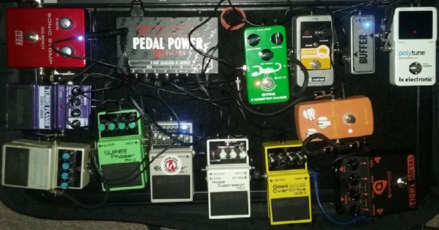 hello, my name is David Polidoro. here’s my pedal board that I wanted to submit for inclusion on Pedal Line Fridays. I’m the guitarist for the band 66 Stitches. my pedal board has always been a work in progress. there’s always an occasional addition, or other ones that come off for a certain period of time. although there are ones that are permanent staples that haven’t left my board in years. it may be messy, but everything works, and I can utilize it with ease and quickness. here’s a break down of what I currently have on there now (from left to right)…