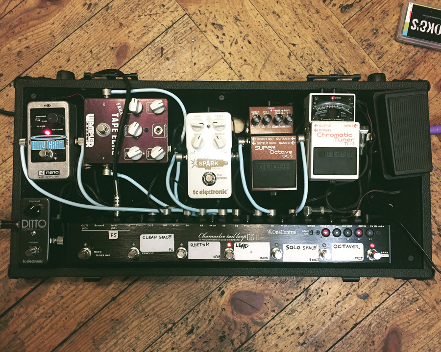 – I only use a few different sounds on a gig, but I totally suck at tap dancing, so I’m using a Chameleo Tail loop from OneControl: it acts as a switch AND as a power distributor: it costs around $350 which is a very fair price, given how much a power distributor and a looper can cost… it’s very well made, and small enough to fit on a small board!