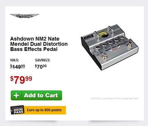 It was just a few days ago I posted a Musician’s Friend Stupid Deal of the Day post, and I have another one to report on today. Today, the Ashdown NM2 Nate Mendel Dual Distortion is available for a killer price. For those of you not familiar with the Musician’s Friend Stupid Deal of the Day, they put on daily deals that range from a wide range of musical gear. The deals are usually great (ie: Stupid) and last for 24 hours only.. or until supply runs out. So if the deal appeals to you, you need to jump on it.. and jump on it quick.