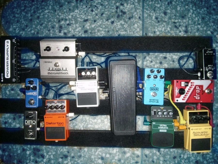 My Pedalboard is made of hardwood with velcro receiver stuck on top. The signal chain is in the following order: