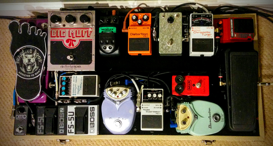 Today’s Pedal Line Friday submission is from James Takacs. If you have a pedal line (doesn’t have to be in a board) for your rig, please email me a photo, bio, description of pedals and routing to pedalline@nulleffectsbay.com. Every Friday I’ll showcase a pedal line submission. Make sure you include any links to your band or music page.