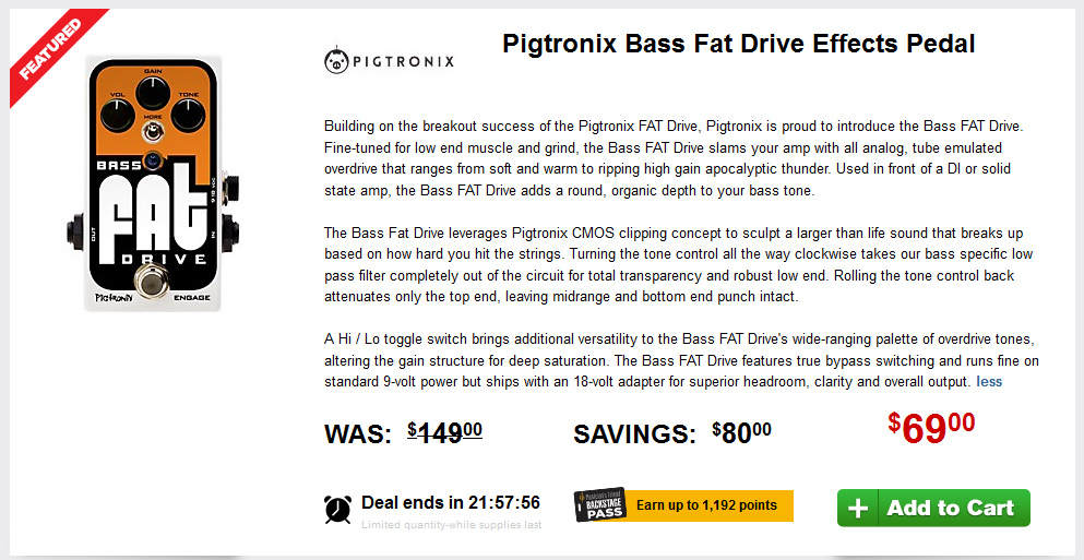 Okay, let’s talk about the deal! Typically the Pigtronix Bass Fat Drive sells for $149, but is currently on sale for a crazy low price of $69! With Stupid Deals of the Day, these deals only last for 24 hours OR until the unit counts gets low. As with all Stupid Deals, if you want this pedal, you need to jump on it. I’ve personally missed opportunities by being slow.