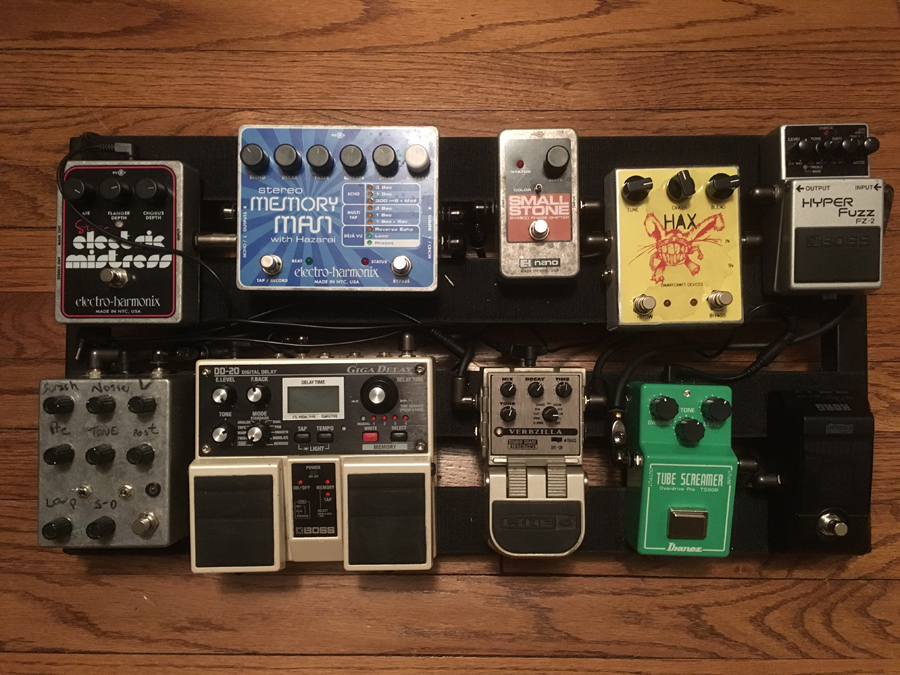 My board routing is Korg tuner > Ts808 reissue > Hyperfuzz fz-2 > Verbzilla > Gigadelay > 4ms Noise Swash > Dwarfcraft Hax > Small Stone > Stereo Memory Man with Hazarai > Electric Mistress.