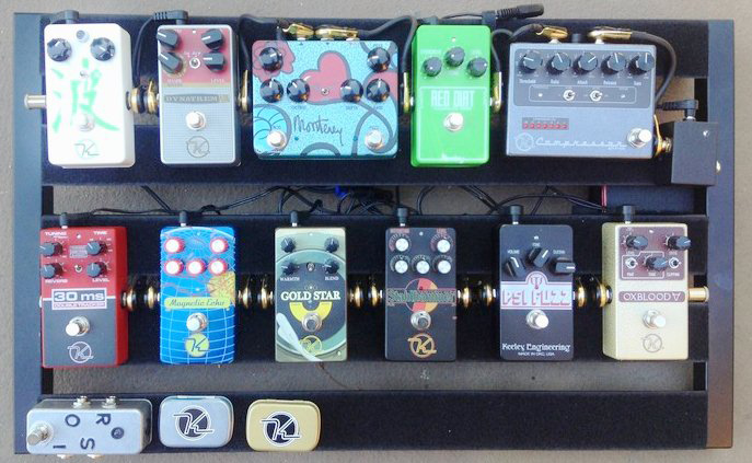 By the looks of my board it seems that I somehow work for Keeley, but I don’t. I became a Keeley fan about 13yrs ago when all he did was modify Boss and Ibanez pedals. My goal was to have an all Keeley board. At first it was hard because all he had was Overdrives, Compressors, and one fuzz. Then all of a sudden he became extremely prolific and started making all kinds of Delays, OD’s, Reverbs, and Modulations. I tried to buy everything he had. I have two full Keely boards, but this one is my favorite.