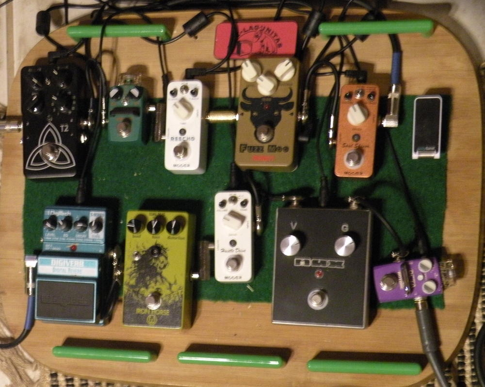 On the upper row, starting from the right- we have a TC Electronic Polytune Clip which while not technically a pedal, is great for affecting my tone by keeping me in tune. So, next in the chain is a Mooer Soul Shiver that shows that one man’s limitation is another man’s choice- it’s a chorus/vibe/Leslie that really sounds either like a vibe-y chorus, or a chorus-y vibe. Fortunately for me, that’s all I want for modulation. That goes into a Moen Fuzz Moo which has to be the smoothest muff-style fuzz I have ever heard.That goes into a Mooer Reecho which goes into a Hotone Tape Eko which goes to a TC Electronic T2 Trinity reverb.