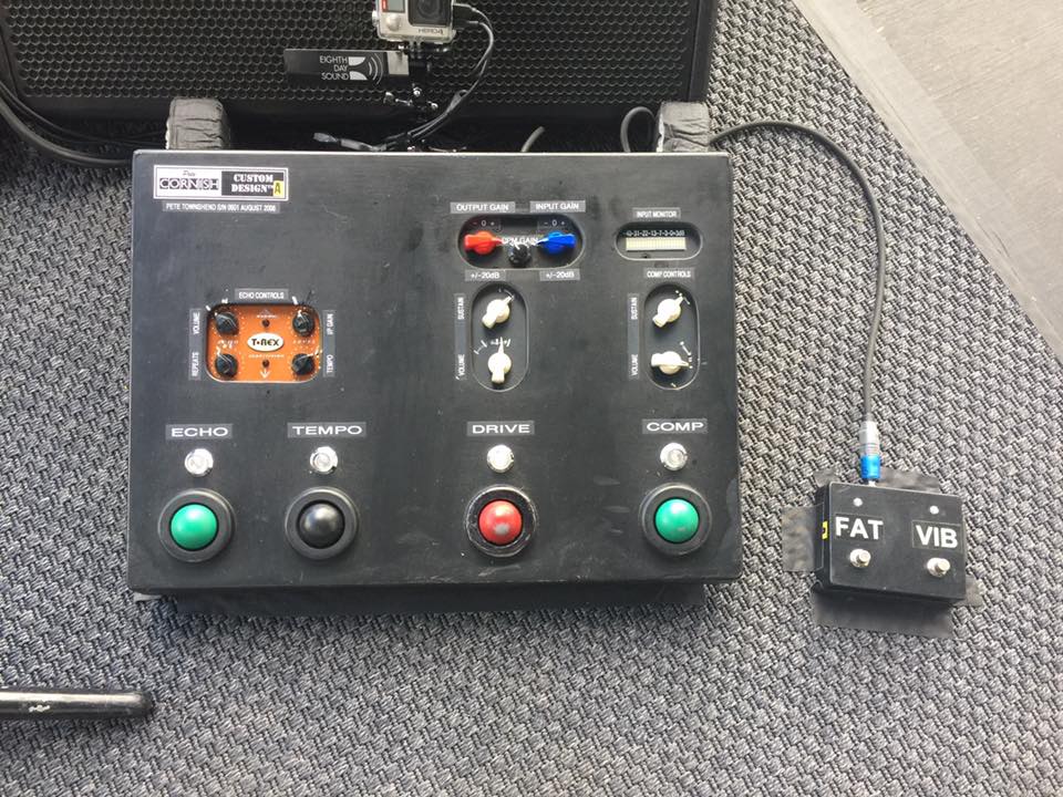 Pete uses a variety of Pete Cornish tools – a very simple integrated pedalboard showing Echo / Tempo / Drive / Comp. You can easily see the Echo is the T-Rex Replica Delay. According to TheWho.net, the Drive is a Boss OD-1 Overdrive and the Comp is the Demeter Comp-1 Opto-Compulator. The FAT and VIB controller is for his Fender Vibro-King amp.