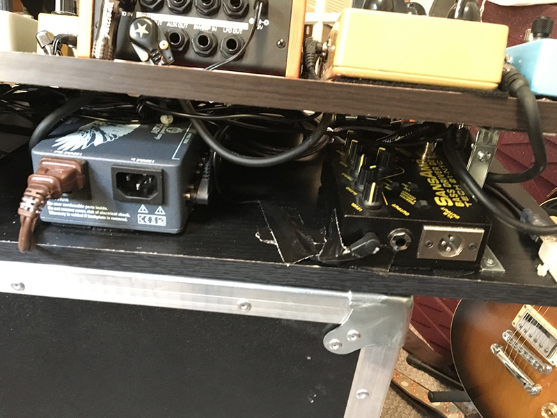I built my board myself without regard for aesthetics. It is angled and has 2 levels because there are 2 pedals that are always on and never change – the Compressor at the front end and the Sans Amp at the tail end. So I mounted these underneath the top level, which is angled for easy access. The whole shebang is powered by a Walrus Audio Aetos power supply which really saves me when I’m touring internationally.