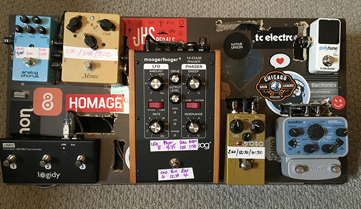 The natural sound of the rig is smooth on the bottom end but with a bit of bite in the upper mids and highs. The Soundblox2 has 2 channels of distortion, one dirty and one completely guttural. The El Oso is a smoother fuzz, which works great beneath a guitar solo. Either of these with the Moogerfooger makes for a pretty intensely complex wash. The Moogerfooger alone is set to add some gentle rolling tone shift without taking the pitch to funny places. The delay is there just in case, and the chorus is there to add sheen every once in a while.