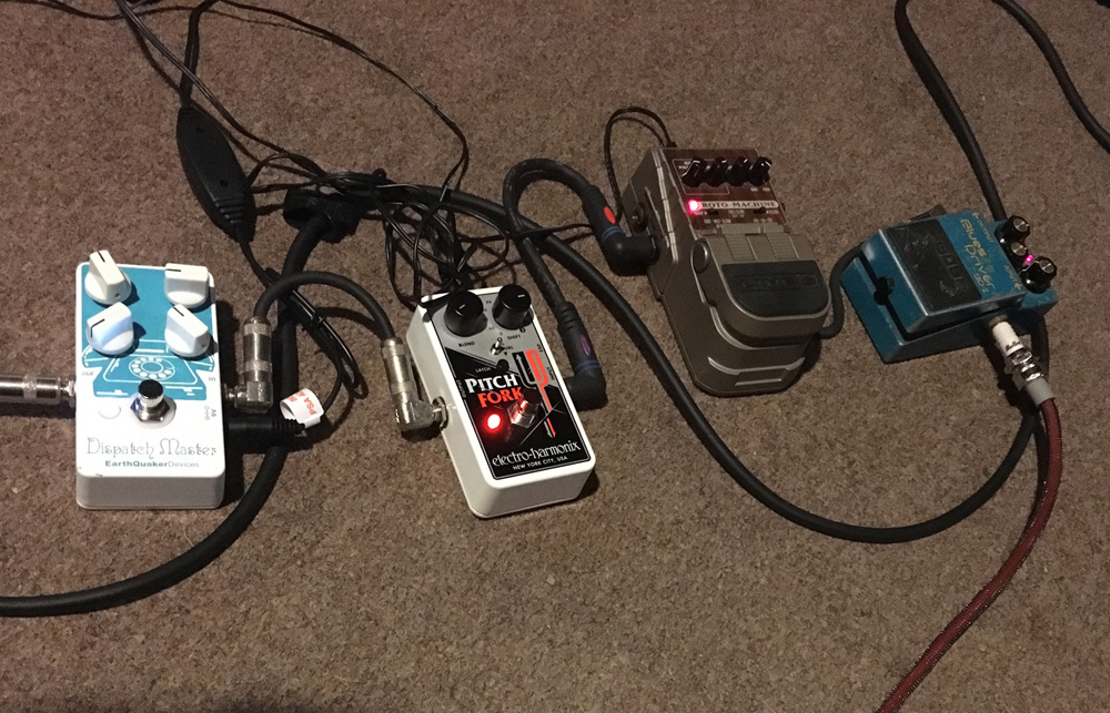 On our EP recorded with David Caggiano for Betamax Studios in Glen Cove, NY, I used the Electro-Harmonix PitchFork, EarthQuaker Dispatch Master, Line 6 Roto Machine & a Boss Blues Driver on the record.