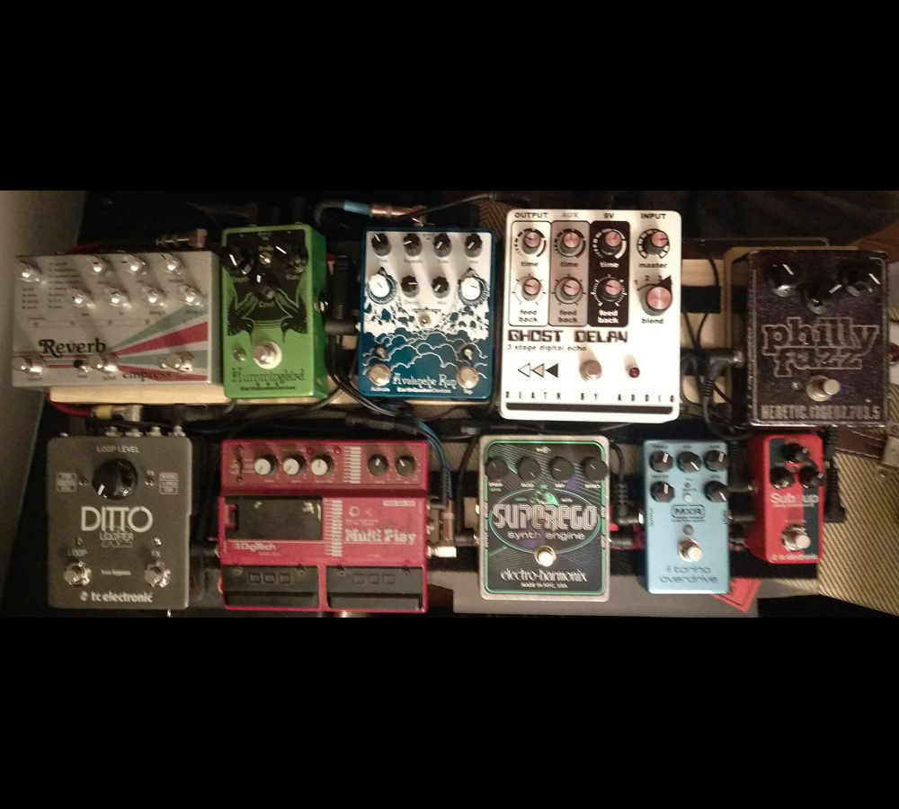 Pedal order: Phillyfuzz Heretic – TC Electronic Sub n Up mini octaver – MXR Il Torino Overdrive – EHX Superego Synth Engine – Death by Audio Ghost Delay – EQD Avalanche Run delay/reverb with expression control via DOD mini expression – Digitech PDS20/20 Multiplay chorus/flange/delay/looper – EQD Hummingbird percussive tremolo – TC Electronic Ditto x2 Looper – Empress Effects Reverb