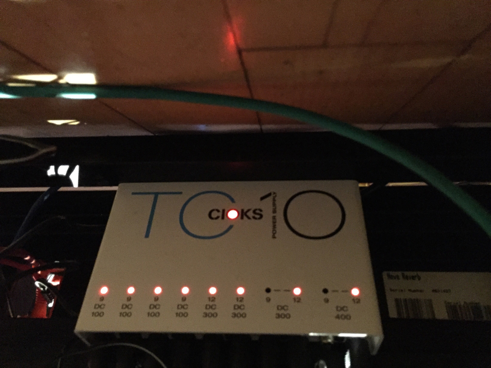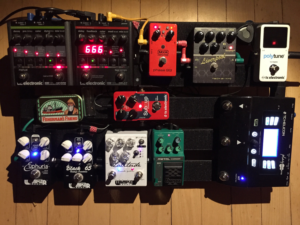 The pedals are powered with a Cioks TC-10 which is mounted under the board. It´s 12V-outs power the NR1, NR1, the TC helicon and the Wampler Black ´65 (for more headroom).