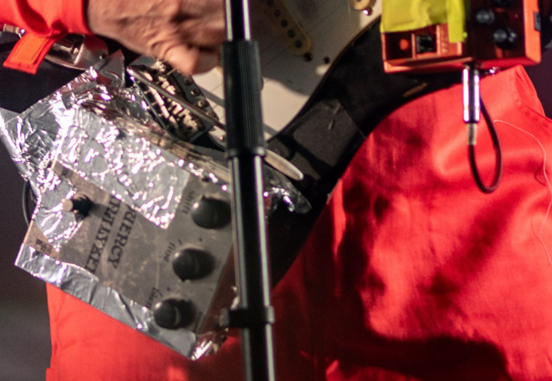 As you can see back in ’78, Mark Mothersbaugh has effects attached to the guitar. And this is what brings me to current times. At this recent performance, you can see Mark with a left handed Strat strung right handed (with only 4 strings E / A – – B / E). I thought was pretty brilliant to use a lefty guitar. That way he can get that surface area to mount a couple of pedals nicely without interfering with the knobs. Now, he’s had different pedals over the years, but the Boss DS-1 (foot pad removed for easy access to the push button) has been pretty standard on the front horn. Check out the photo from Patric Carver