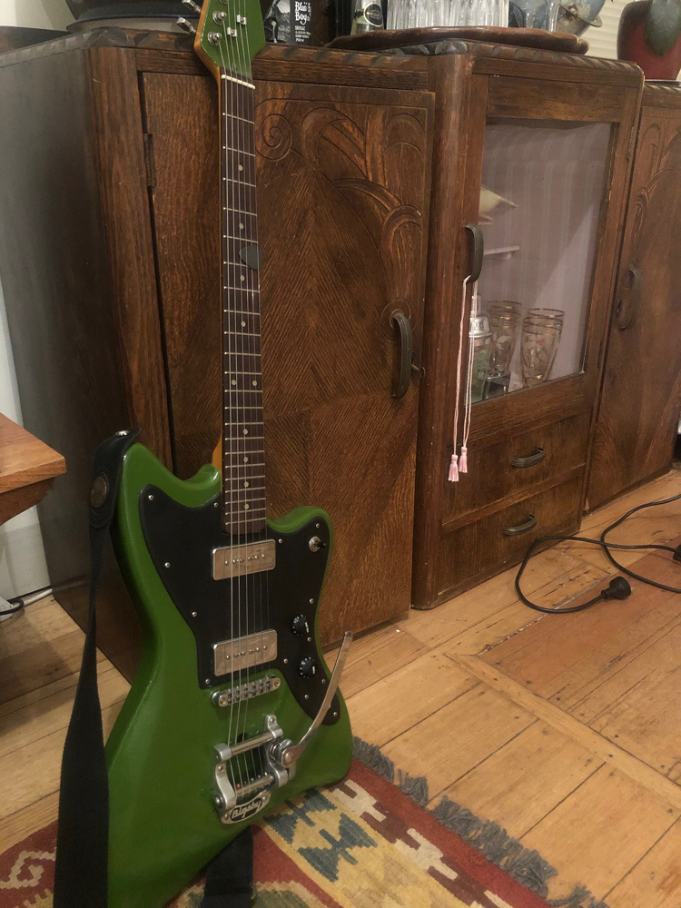 Lets start with the thing I actually play, the instrument you see pictured is a custom made, 1 of 1, frankenstein beast made by yours truly. This guitar started life as an oddly shaped cheap & nasty thing, in the discount section of my local shop. I loved the shape, bought it, gutted it, re-fitted it with high quality components and turned it into a workable instrument. This is actually the second iteration, it was black at first, now it’s green, has a wooden pickguard, the pickups are also new, they’re Bareknuckle Supermassive p90’s. They’re brilliant. For this album I’m using three different tunings, BEADF#B, AEADF#B and GEADF#B. Yeah, gets loose.
