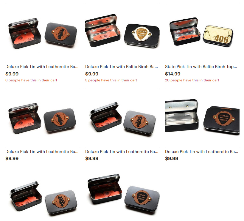 Out of this brainstorming session, I came up with some fun Deluxe Guitar Pick Tins. These are black matte powder coated Altoid-style tins, but with a cool leatherette or Baltic Birch wood topper that are riveted to the top of the tin. Perfect for mounting on the pedalboard, or just have laying around in the studio/rehearsal space, etc. We also have a cool ‘State Pride’ tin where you can customize the laser engraved state outline and provide your area code!